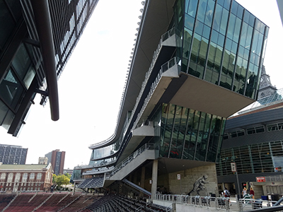 The pavilion is the signature element of the stadium’s recent renovation. The 115,000-sq.-ft, 130-yard-long pavilion wraps the upper west edge of the seating bowl and towers more than 120 ft above the field below. Its dynamic form defines the stadium edge, and a curtain wall with large glass panels facilitates views through and from the structure, showcasing the efficient X-braced structural steel frame that helps to establish the building’s identity.