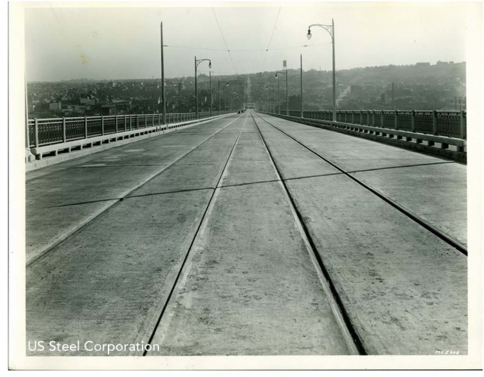 Opened in 1937, this impressive steel superstructure, originally known as the Homestead High-Level Bridge, was designed by Allegheny County with George S. Richardson as chief engineer. American Bridge Company constructed it. The total length of the bridge is approximately 3,100 ft, and it was designed to carry four traffic lanes and a pedestrian walkway on each side. Additionally, the bridge was designed to carry trolley traffic on rails placed in the center two lanes.