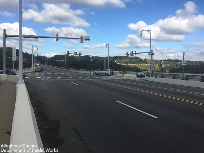 Current view of the Homestead Grays Bridge deck, looking towards Squirrel Hill.